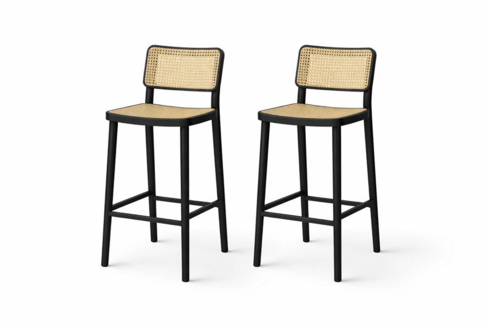 Set of 2 Black Wooden Frame Bar Stools with Rattan Seat and Backrest