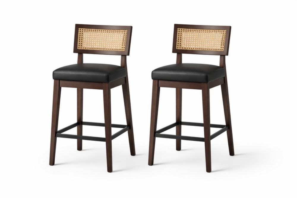Set of 2 Brown Wood Bar Stools with Black PU Leather Cushions and Rattan Backrest