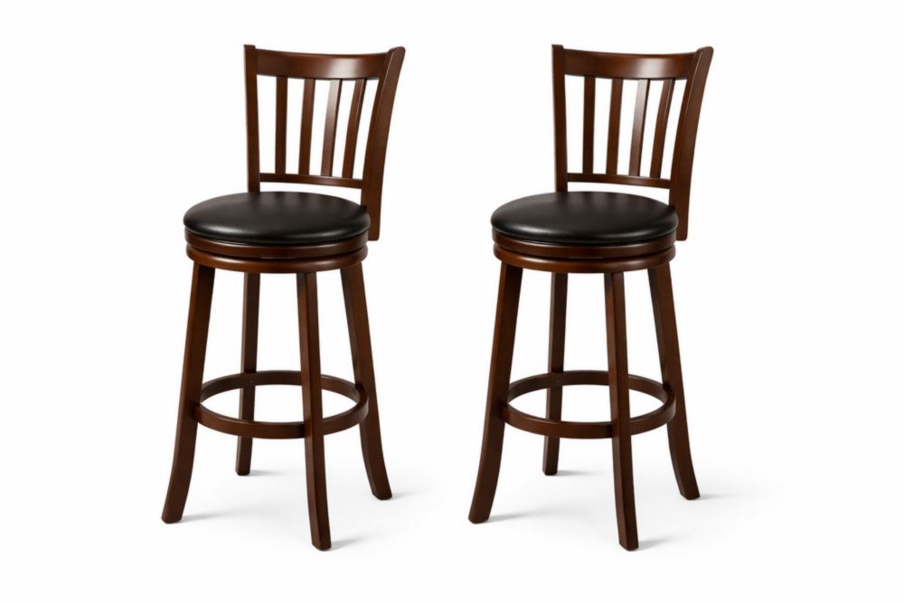 Set of 2 Wood Swivel Bar Stools with Black Faux Leather Seat Brown
